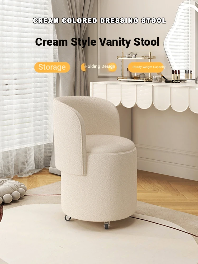French Cream Vanity Stool with Swivel Wheels - Foldable Storage Makeup Chair for a Touch of Luxury in Your Bedroom