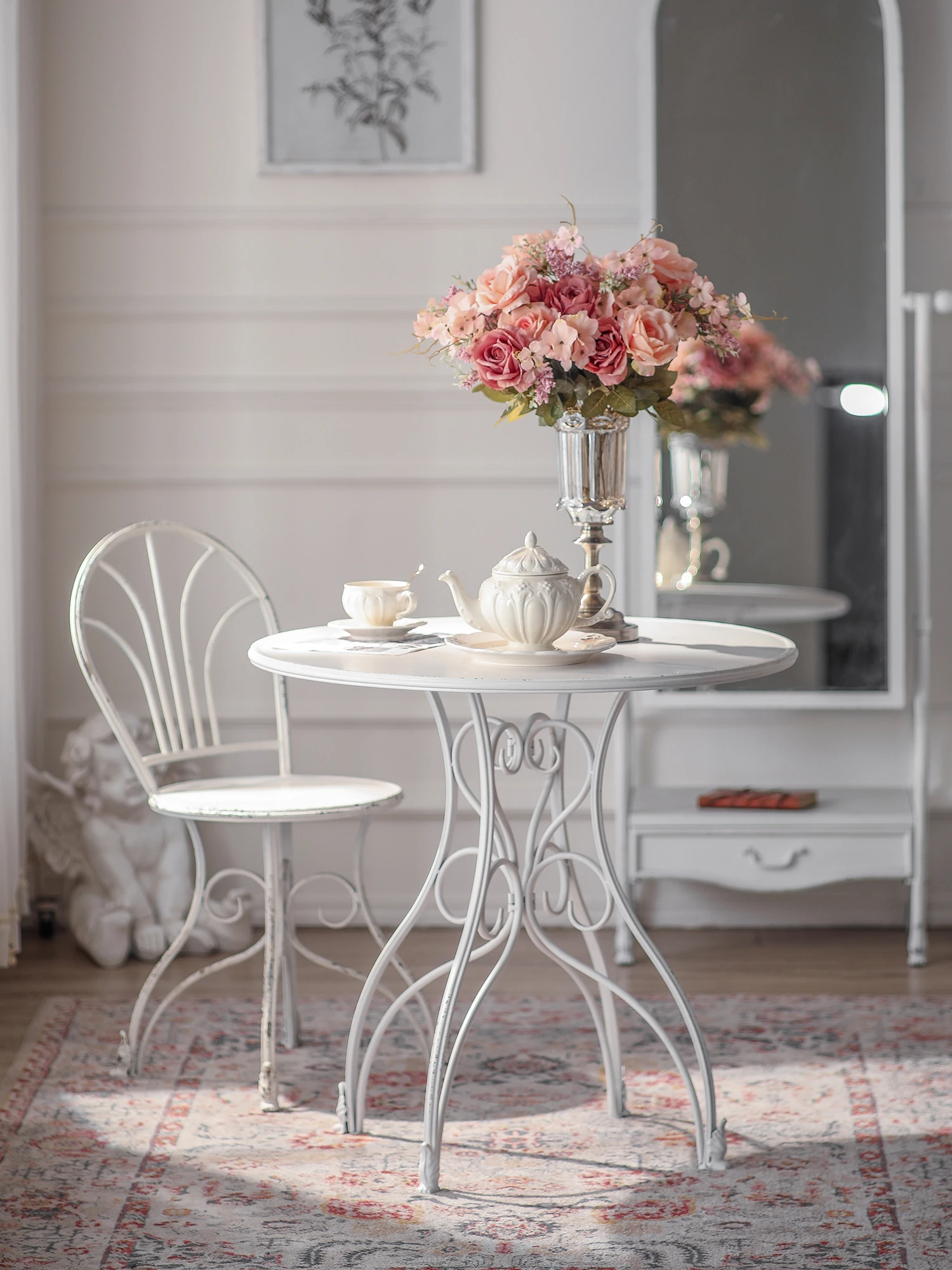 French Romantic Round Iron Retro White Coffee Table Set for Living Room and Balcony - Perfect Outdoor Dining Table and Chairs for Casual Gatherings in Your Courtyard