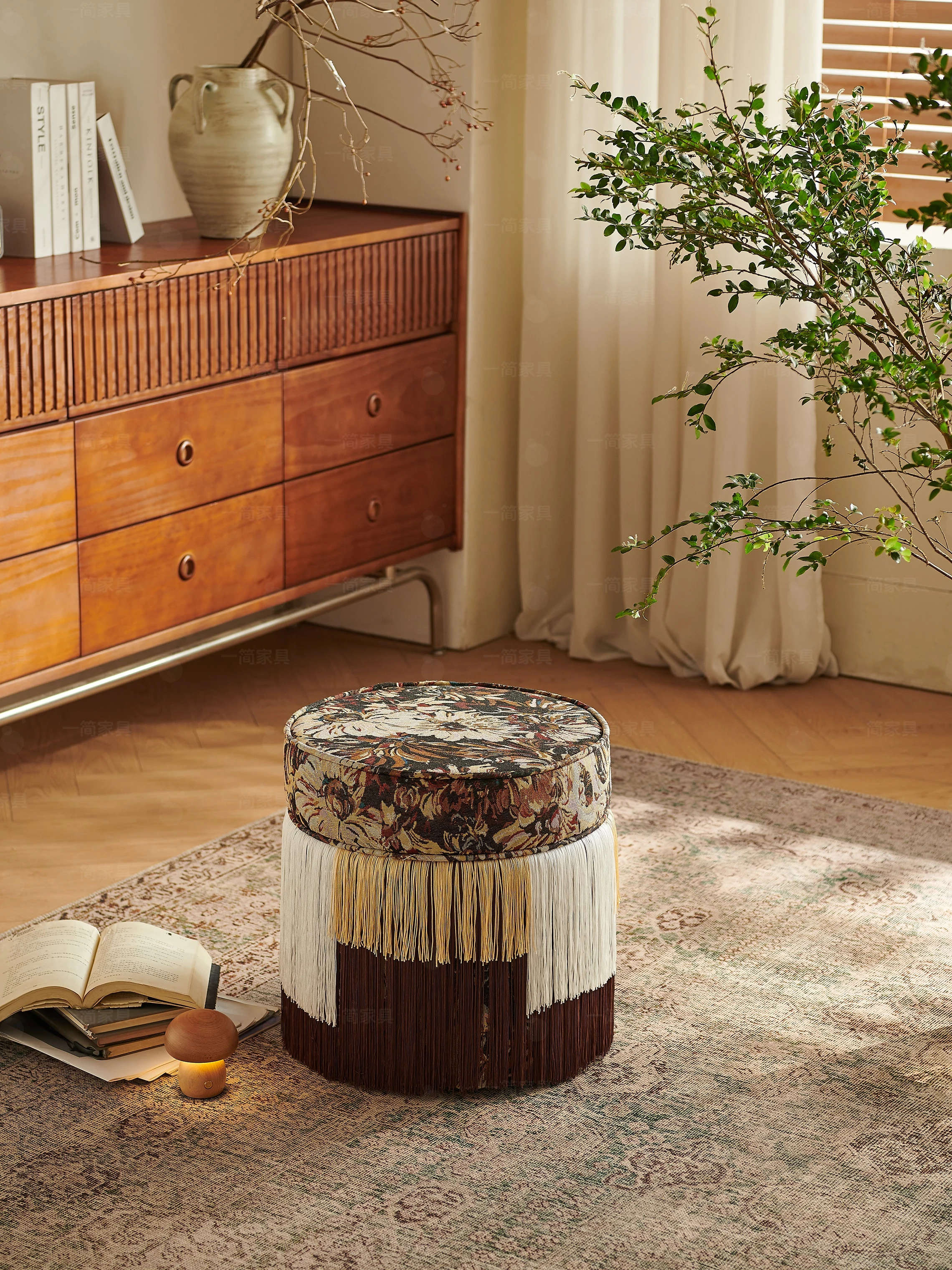 French Vintage Makeup Stool with Tassels - Round Vanity Seat, Versatile Sofa and Shoe Bench, Perfect for Guesthouses and Hotels, Chic Tea Stool for Elegant Spaces