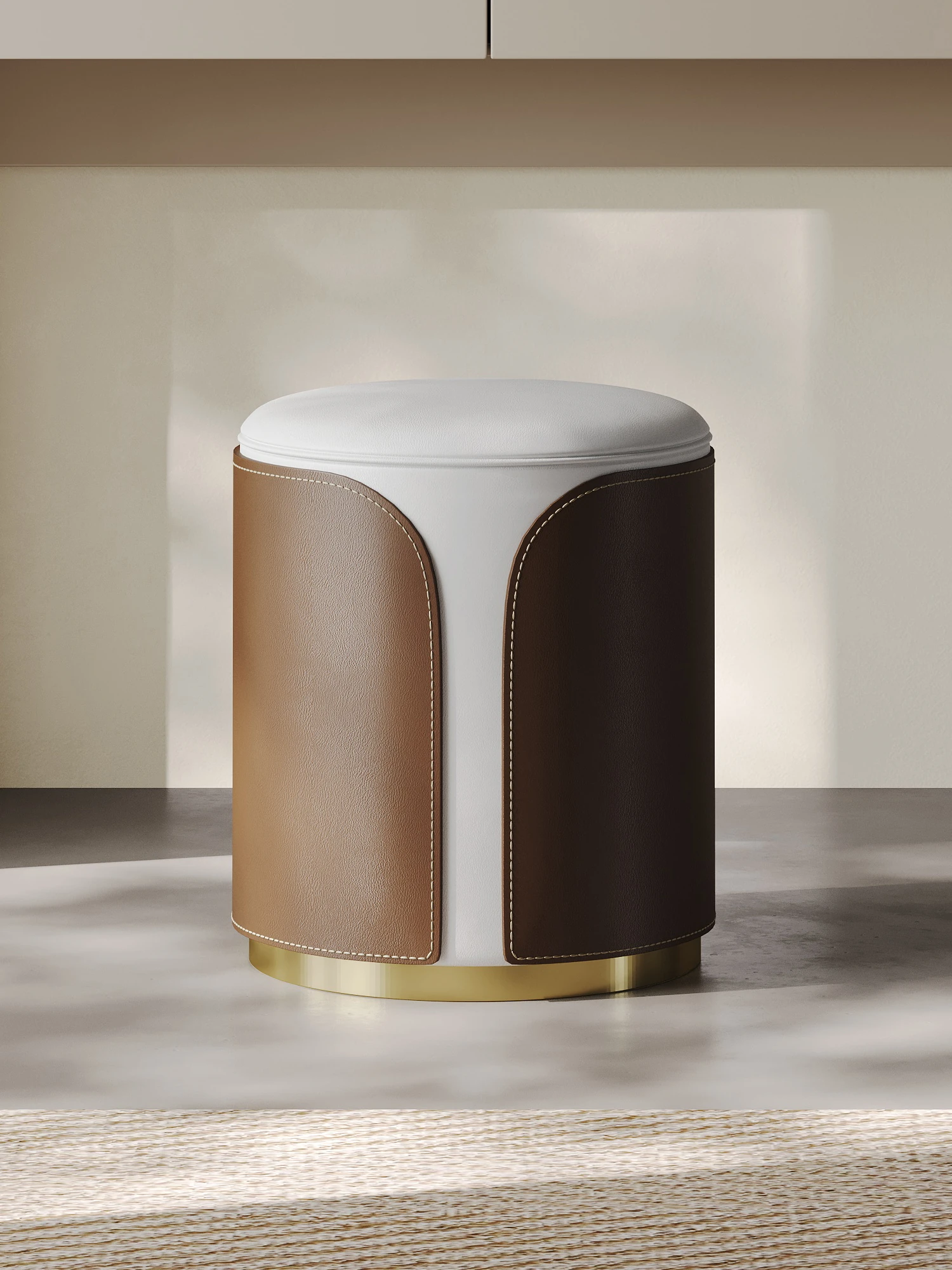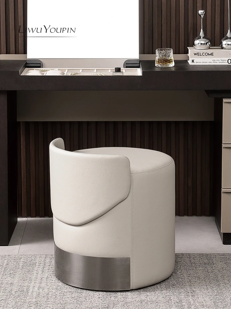 Genuine Top Layer Cowhide Backrest Stool - Elegant Leather Ottoman for Living Room and Bedroom Vanity - Italian Minimalist Design Round Stool
