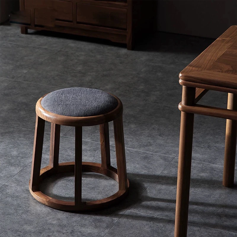 新中式スタイルの禅テイスト茶用スツール - 無垢材の円形デザイン、シンプルで低い高さ、老榆木を使用したおしゃれな靴置き&ソフトパッケージのスツール。心を落ち着けるひとときをお届けします!