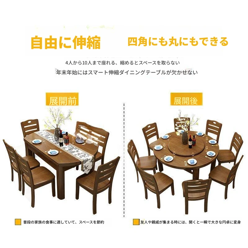 【香港送料無料】天然木製ダイニングテーブル&チェアセット!省スペースで便利な円形&四角形両用、回転式ターンテーブル付き。小さなお部屋でも使いやすい伸縮可能なデザインで、家庭やレストランに最適!